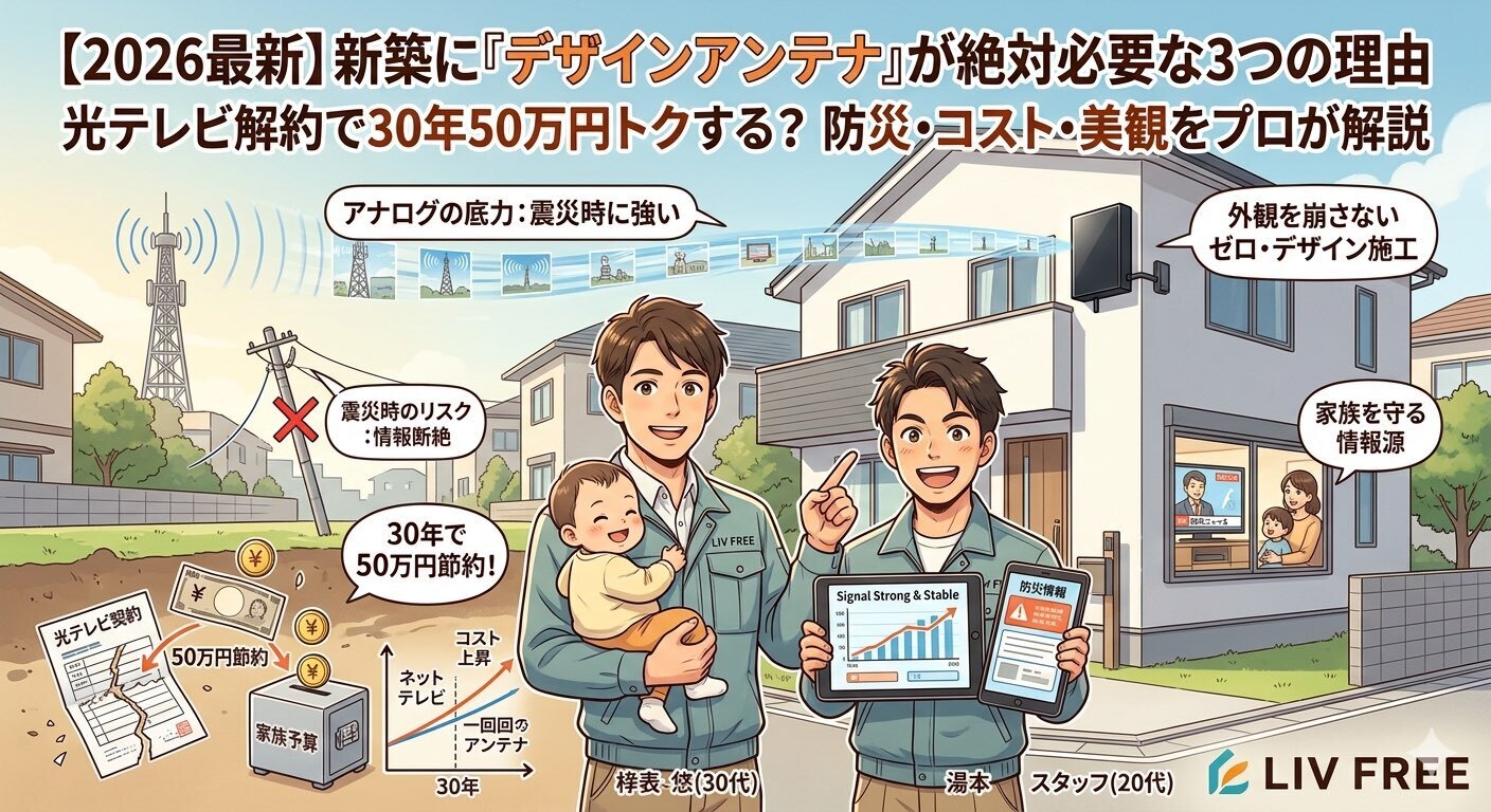 実は以前は屋根裏設置(隠蔽)も検討していましたが、今のLIV FREEは「壁面デザインアンテナ」を推奨しています。その理由は、現場のプロとしての誠実さにあります。