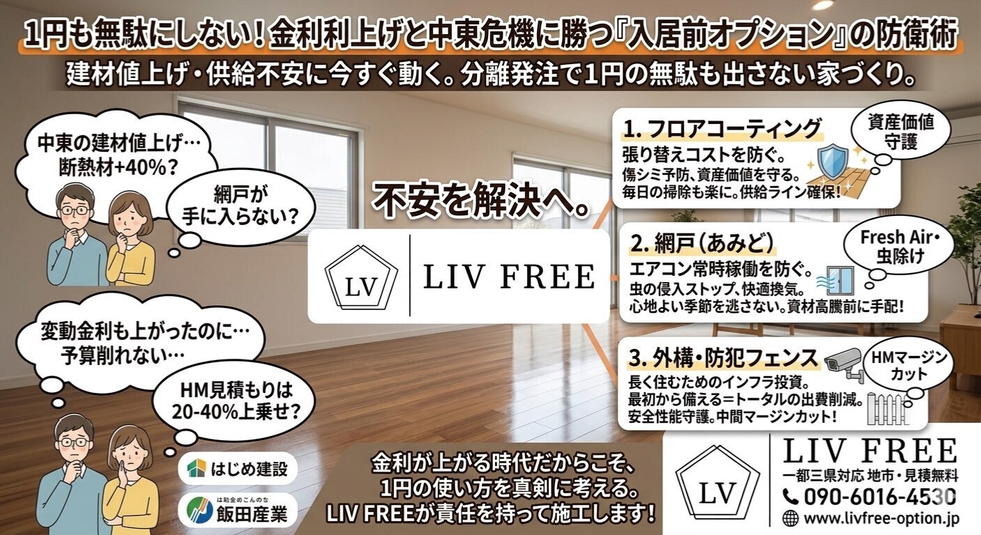 2026年4月現在、中東情勢の影響による建材の値上がりと供給不安は、住宅のオプション工事にも確実に波及しています。